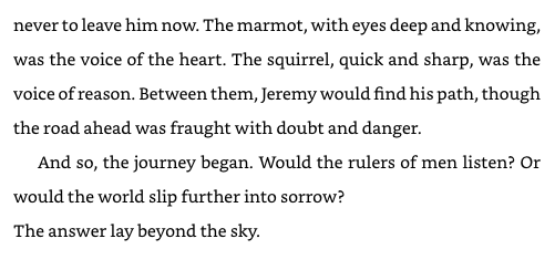 I love how the story talks about how important it is for everyone, people, animals, and the earth, to work together. A child is chosen to fix everything, and that makes me think that even the smallest person can do something big and important. This story is full of magic, hope and humor. It's also a lesson about testing the very nature of humanity’s heart. It questions whether humanity is willing to listen and how we should respect our planet and each other.